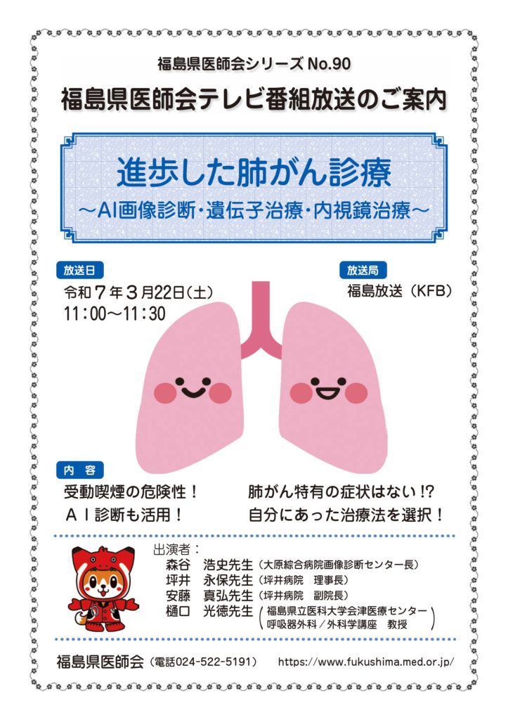 内 容:進歩した肺がん診療~AI画像診断・遺伝子治療・内視鏡治療~