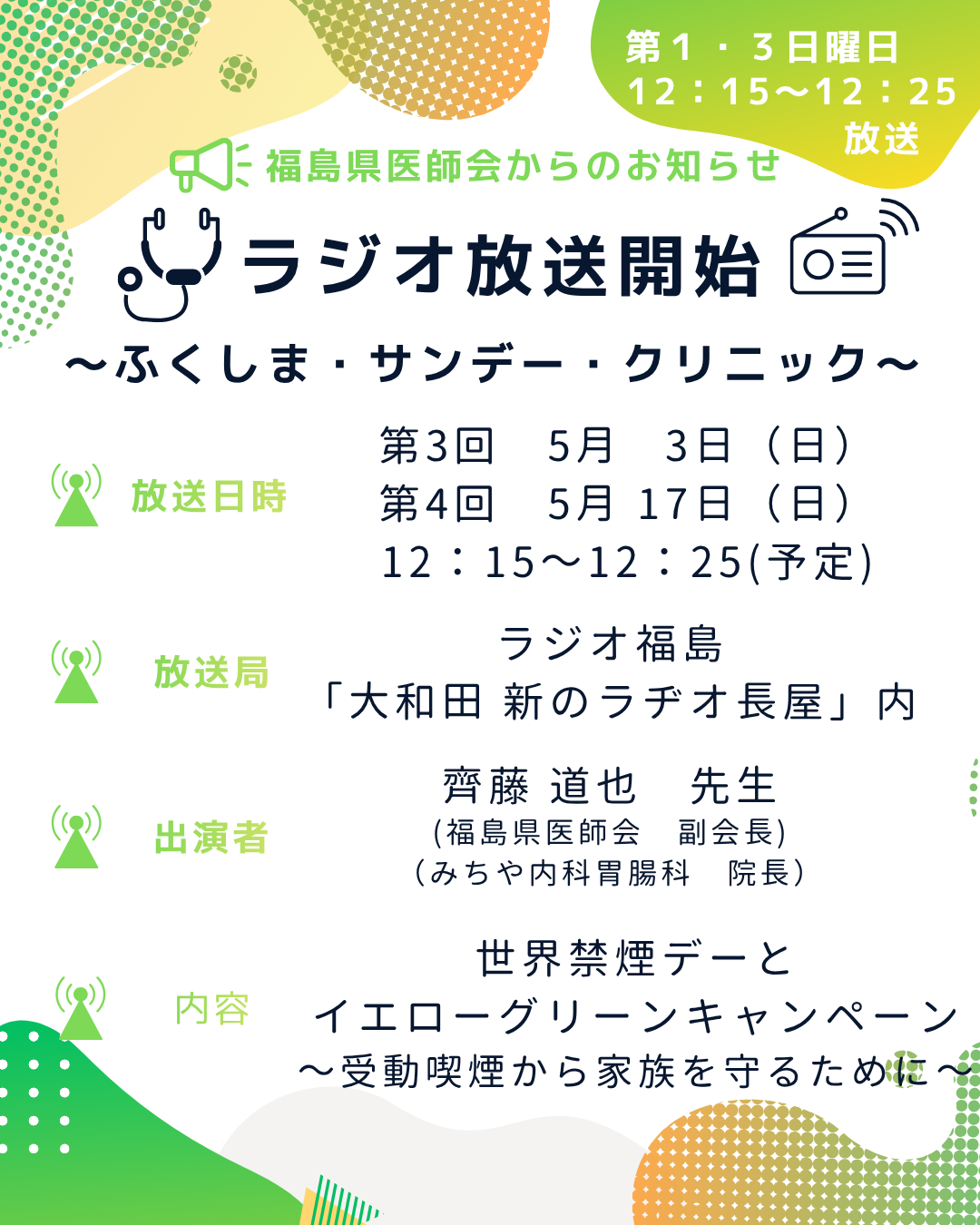 放映日:5月3日(日)12:15~12:25、 5月17日(日)12:15~12:25 放送局:ラジオ福島 「大和田 新のラヂオ長屋」内 出演者:齊藤 道也先生(福島県医師会 副会長)(みちや内科胃腸科 院長) 内 容:世界禁煙デーとイエローグリーンキャンペーン~受動喫煙から家族を守るために~